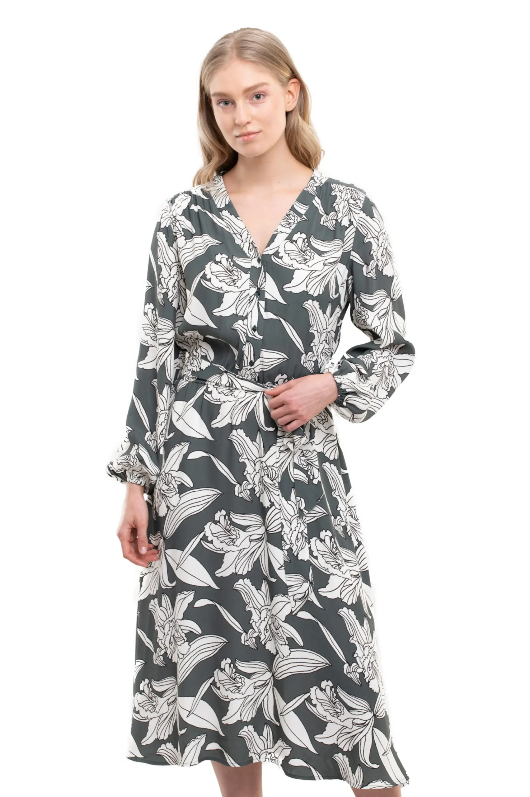 Your Face Mekko Naisille Kuviollinen Kukkakuosillinen Mekko V-Paantiella. Mekossa On Nappilista Puolivaliin Saakka Ja Pussitetut Pitkat Hihat. Mekko On Kurottu Vyotarolta Ja Levenee Alaspain. Materiaalina On Laadukas Viskoosi Kangas. Takapituus Koossa S On 115 Cm.