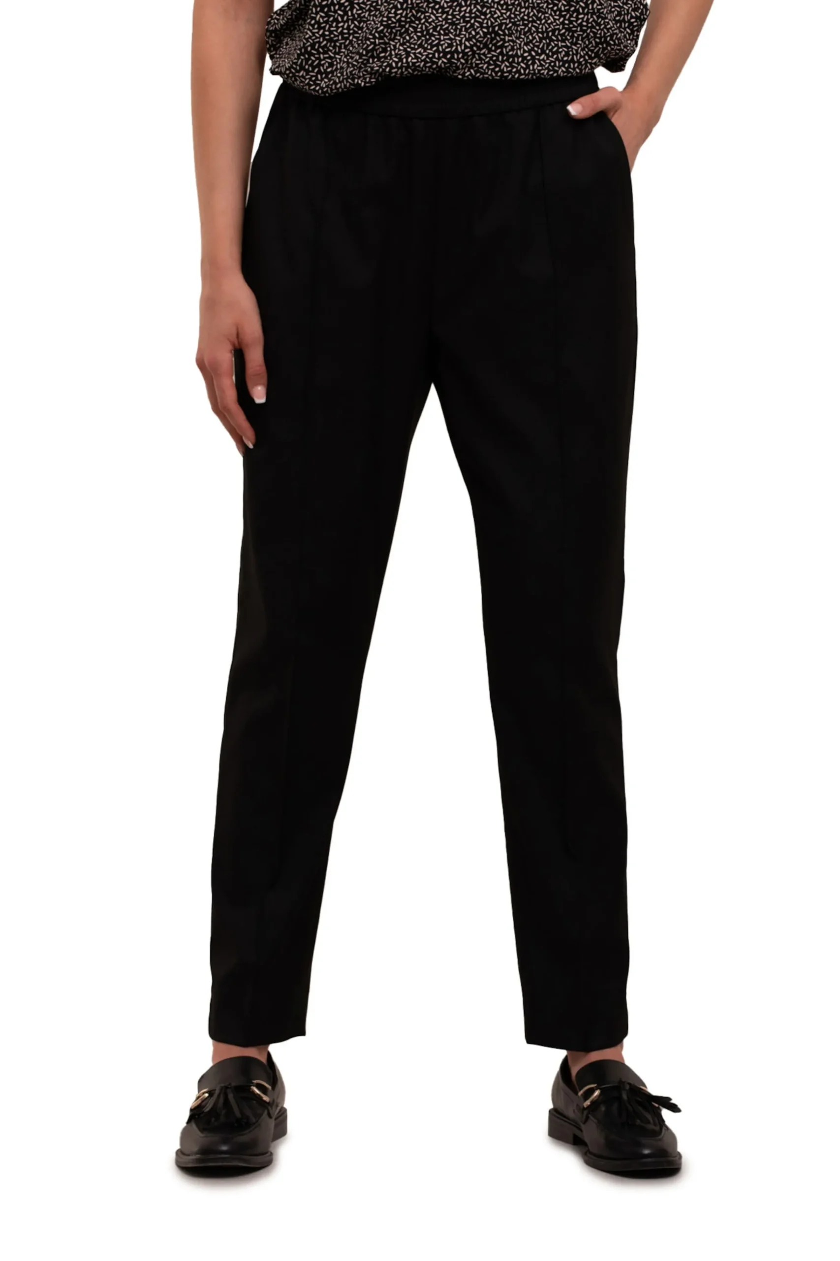 Your Face Naisille Rento, Prassatty, Suora Housu Taskuilla Ja Kuminauhavyotarolla. Materiaalina On Kestava Ja Joustava Polyester-Viskoosisekoite Kangas.