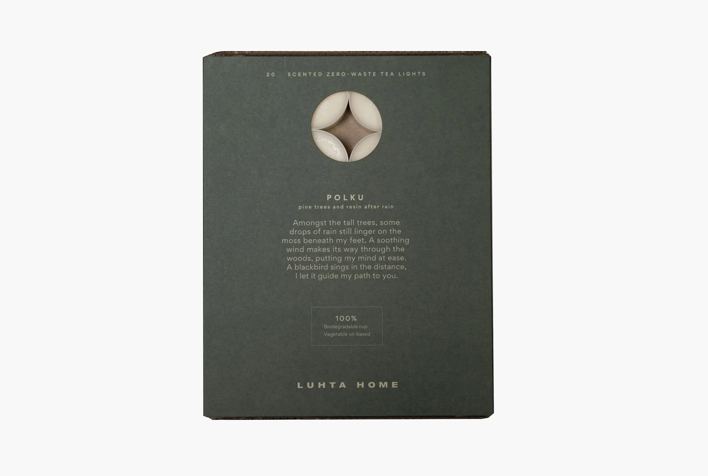 Luhta Home Luhta Home Polku-Huonetuoksu Vie Sinut Sateenraikkaaseen Metsaan, Jonka Tuoksussa On Haivahdys Pihkaa Ja Lehtimetsaa. LampoKynttilät On Valmistettu 100% Kasvioljypohjaisesta Vahasta Ja Lampokynttilan Kuppi On Biohajoavaa Seosta. Pakkaus Sisaltaa 20 Lampokynttilaa, Joiden Paloaika On Noin 6 Tuntia.